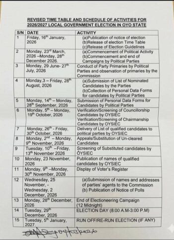 “This decision became necessary following the recent revision of the national electoral timetable by the Independent Electoral Commission ( INEC) , which moved the Presidential and National Assembly elections from 20 February 2027 to 16 January 2027 – a date previously scheduled by OYSIEC for the conduct of Local Government Elections in Oyo State – thereby creating an operational and logistical overlap.