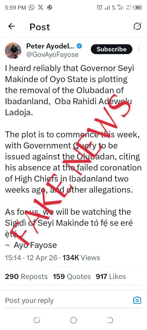 The former Ekiti State Governor, Ayo Fayose, wrote on his X handle that Governor Seyi Makinde was plotting to remove Ladoja as Olubadan of Ibadanland.